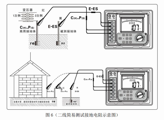 二線法測試:此方法是不使用輔助接地棒的簡易測量法,利用現有的接地電阻值最小的接地極作為輔助接地極,使用 2 條簡易測試線連接(即C(H)-P(S)接口短接、E-ES 接口短接)。可以利用金屬水管、消防栓等金屬埋設物、商用電力系統的共同接地或建筑物的防雷接地極等來代替輔助接地棒C(H)、P(S),測量時注意去除所選金屬輔助接地體連接點的氧化層。接線如下圖。